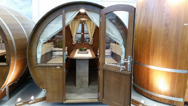 In diesem Jahr ziehen sicherlich die beiden Holzfässer vor der Tür der Stadthalle, eins als Schlaf- und eins als Wohnzimmerfass, die Aufmerksamkeit vieler Besucher auf sich. Denn Holzfässer schaffen die nötige Atmosphäre. Die Gäste-Fässer von Tischlermeister Keitel sind ein geselliger Ort, der viel Freude bereiten wird. Natürlich können sie auch energieautark sein – mit Fotovoltaik, Solarthermie und mittlerweile handelsüblichen Speichermöglichkeiten.